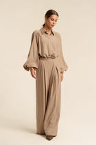 Брюки покроя "barrel", расширенные в области икры и зауженные к низу. Пояс притачной, эластичный в области спинки. По передним половинкам брюк-застежка и боковой наклонный карман. По задним-вертикальный шов. Боковой шов смещен в сторону центра передних половинок брюк. По низу-пата с регулирующими пуговицами, позволяющая создавать разную ширину брюк внизу.
