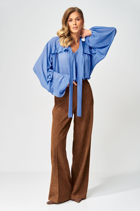 Брюки палаццо с притачным поясом из мягкой вельветовой ткани. Спереди застежка гульфик на молнии и петлей и пуговицей по поясу. По задней частям брюк вытачки. Пояс с резинкой в боковых частях. Брюки с заутюженными стрелками. Длина брюк с учетом пояса - 109 см. Данная модель прекрасно сочетается с другими моделями из нашей коллекции 15410,15377,15409,15416. Создайте гармоничный образ, комбинируя эти изделия!