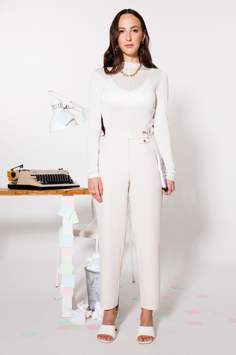 Лаконичные прямые брюки — основа базового гардероба. Выполнены из плотной костюмной ткани на основе вискозы, дышащей и приятной к телу. Отрезной пояс обеспечивает комфортную посадку по фигуре. По переду и сзади - декоративные клапаны декорированные пуговицами. Длина брюки - 98 см.