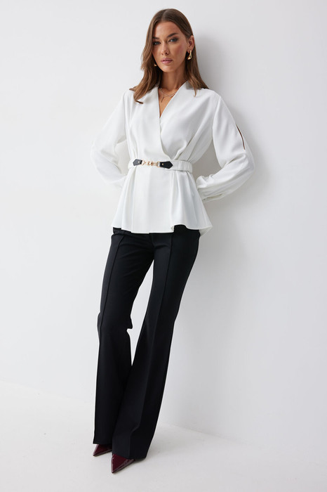 Брюки прямого силуэта  с защипами из трикотажного полотна. По верху брюк  притачной пояс и центральная застежка на петли и пуговицы. На передних половинках защипы и декоративные листочки. На задних половинках брюк накладные карманы.  Обращаем ваше внимание, что фурнитура может отличаться от фото.
