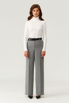 Брюки прямого силуэта с защипами из трикотажного полотна. По верху брюк притачной пояс и центральная застежка на петли и пуговицы. На передних половинках защипы и декоративные листочки. На задних половинках брюк накладные карманы. Обращаем ваше внимание, что фурнитура может отличаться от фото.