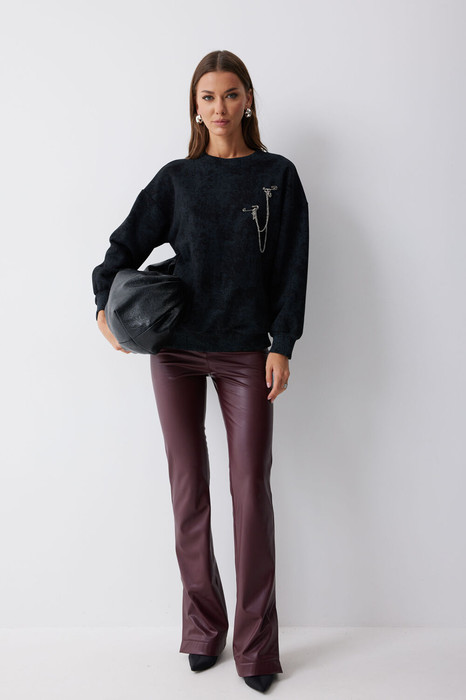 Брюки прилегающего силуэта расширенные книзу  из экокожи. По верху притачной пояс с застежкой на петлю и пуговицу. На передних половинках обработана застежка молния в среднем шве. По низу брюк в боковом шве шлица.Обращаем ваше внимание, что фурнитура может отличаться от фото.
