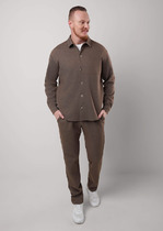 Брюки мужские из трикотажного полотна "лининг" свободного покроя, со смещенными к центрам передних половин боковыми швами, карманами в боковых швах и притачным поясом с эластичной тесьмой внутри. Нижние срезы обработаны подгибкой с эластичной тесьмой. Для регулирования степени прилегания изделия по талии предусмотрен шнурок, вставленный через две обметанные петли в центре пояса спереди.