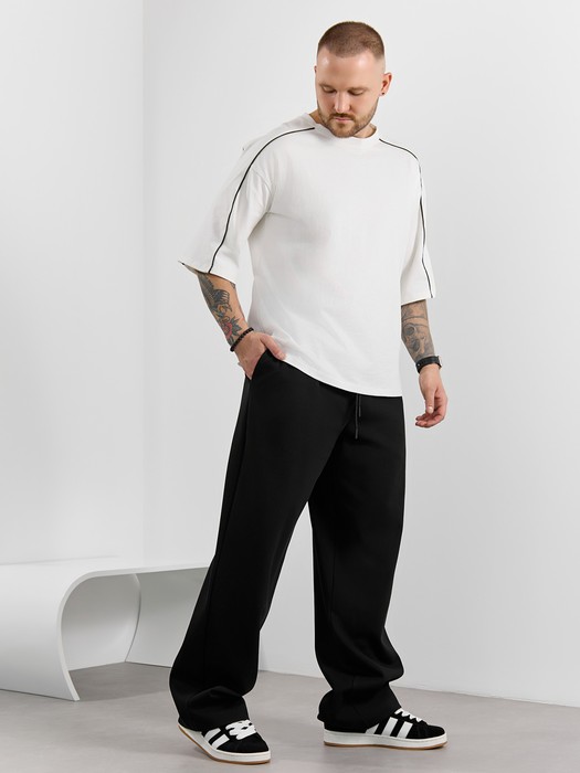 Брюки мужские из трикотажного полотна "интерлок-пике", на притачном поясе с эластичной тесьмой внутри, с карманами в боковых швах. Низ брюк прямой с подгибкой. Для регулирования степени прилегания изделия по линии талии предусмотрен декоративный шнурок, вставленный в пояс и продетый через две обметанные петли в центре.
