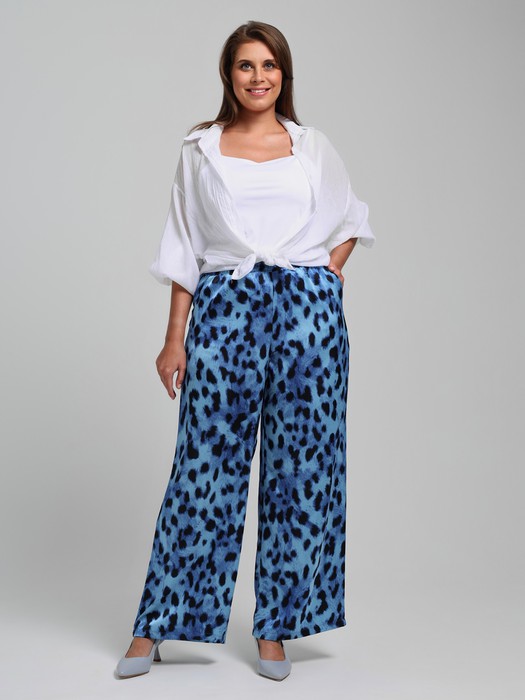 Брюки женские из тканого полотна «искусственный шёлк полиэстер» с набивным рисунком, длинные, свободные, с карманами в боковых швах, на притачном поясе с эластичной тесьмой внутри.