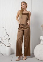 Брюки со стрелкой свободного кроя, верхний срез представлен широкой резинкой, с карманами.