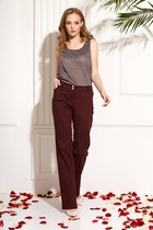 Брюки средней посадки, свободные вверху, слегка зауженные к низу с наклонными боковыми карманами. Низ брючины фигурный. Пояс широкий отрезной, сзади на эластичной тесьме-резинке, по переду застежка на петлю и пуговицу.