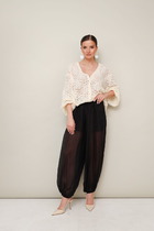 Широкие брюки с двойным поясом из отделочной контрастной хлопковой ткани. Изделие по линии талии на резинке с имитацией гульфика. Карманы с отрезным бочком.