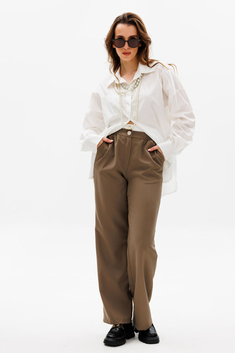 Брюки прямого силуэта с вытачками по задней половинке. Наклонные карманы в боковых швах по передней половинке изделия. Застёжка на тесьму-молнию с резинкой по поясу. Отделочная деталь пояса на резинке из рубашечной ткани создаёт имитацию двойного пояса.