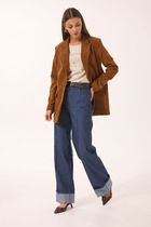 Брюки прямого кроя. На передних половинках брюк карманы с наклонным входом и отрезной боковой частью. Пояс притачной, подкройной. Линия талии приспущена.