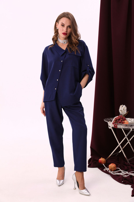 Комфортные брюки свободного кроя со складками и карманами по переду, зауженные к низу. Пояс притачной со шлёвками и центральной застёжкой на гульфик и молнию. По спинке изделия накладные карманы и резинка.