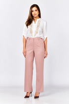 Прямые брюки с двойным поясом из отделочной контрастной ткани. Изделие по линии талии на резинке с имитацией гульфика. Карманы с отрезным бочком.