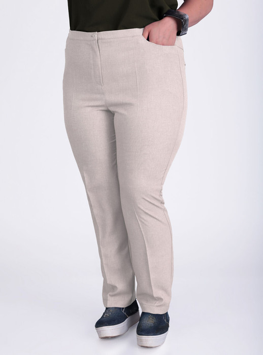 Брюки из ткани лен-вишер. Пояс с резинкой по бокам. По передней части брюк имеются функциональные карманы джинсового стиля. На задней половинке брюк есть кокетка и прорезные карманы в рамку. Классические, зауженные к низу однотонные брюки с заутюженными стрелками подойдут как для деловых встреч, так и для романтических прогулок.
