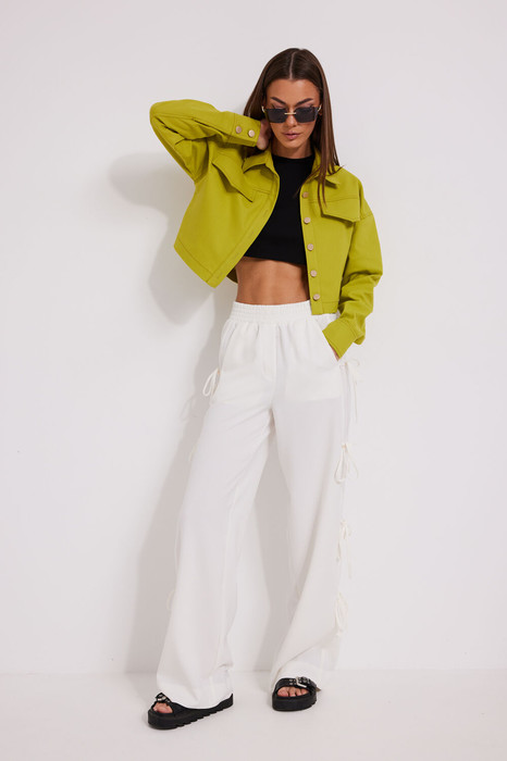 Брюки прямые, свободной формы, со вставкой по боковому шву. В смещенном боковом шве расположены наклонные карманы. Спереди имитация застежки на гульфик. В боковые подрезы вставлены шнурки из основной ткани, которые при завязывании уменьшают ширину брюк. Верхний срез брюк обработан поясом с резинкой.