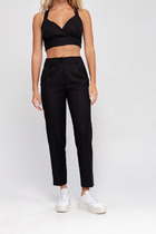 Классические укороченные брюки из текстильной ткани. Детали: брюки со средней посадкой, притачной пояс со шлевками, передние половины с небольшими мягкими складками и заутюженными стрелками, застежка на молнию и пуговицу, боковые карманы.