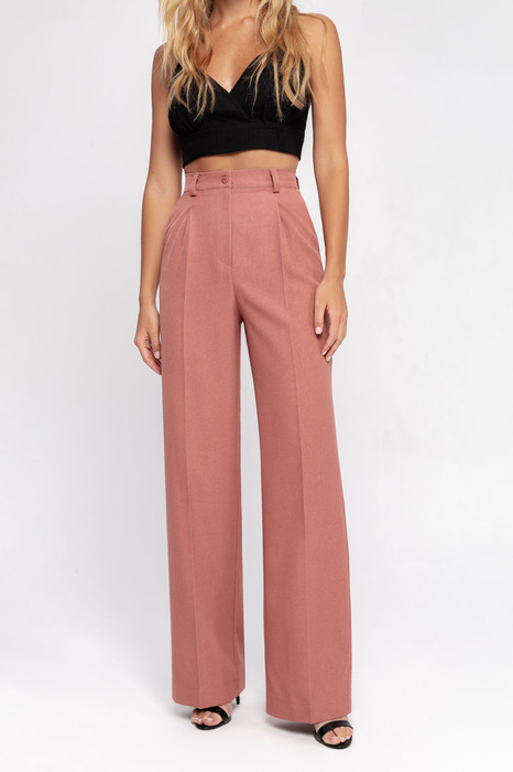Текстильные брюки-палаццо с высокой посадкой. Детали: высокая посадка, широкие и длинные брюки, притачной пояс со шлевками, передние половины с небольшими застроченными мягкими складками и заутюженными стрелками, застежка на молнию и пуговицу, боковые карманы