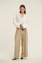 Детали: брюки с притачным поясом со шлевками, складки у пояса, застежка на молнию и пуговицу, боковые карманы, заутюженные стрелки. Задние части брюк с вытачками и имитацией карманов.