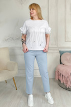 Брюки женские из трикотажной хлопковой ткани (двунитка), слегка заужены к низу. В боковых швах расположены карманы. По низу передних половинок есть защип. Задняя половинка брюк с отрезной кокеткой и накладными карманами. Вверх брюк обработан поясом с резинкой (без молнии).  ПОЯС  ВХОДИТ В КОМПЛЕКТ.