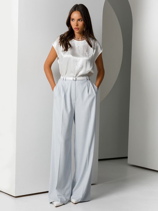 Модель свободного кроя, на притачном поясе, со шлёвками. Сзади пояс присборен на резину. Спереди защипы и карманы с листочкой. Застёжка на молнию и крючки на поясе. Сзади прорезной карман с листочкой. Ремень в комплект не входит.