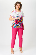 Брюки женские из гладкокрашенного трикотажного полотна «кулирка» с лайкрой, длинные, полуприлегающего силуэта, на притачном поясе с эластичной тесьмой внутри и карманами в боковых швах. Передние половины застрочены по центральным линиям, на задних половинах обработаны две вытачки в области талии.