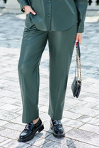 Брюки из мягкой вискозной ткани свободного кроя, чуть расширены к низу. Сверху широкая обтачка со шлевками для съёмного пояса. Спереди боковые косые карманы. Застежка на потайную тесьму-молнию в боковом шве.