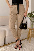 Брюки женские спортивного стиля из эластичного хлопкового полотна, прямого от бедра кроя. По передним половинкам брюк расположены фигурные карманы. По передним и задним половинкам отсрочены канты. Пояс брюк притачной с эластичной тесьмой-резинкой, в передней части пояса вставлен декоративный шнурок с металлическими наконечниками.