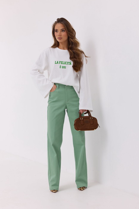 Брюки прямые из джинсовой ткани. Верх на поясе со шлевками. Застежка по переду на молнию и кнопку на поясе. В боковых швах карманы. Сзади накладные карманы. На кармане выполнена вышивка.