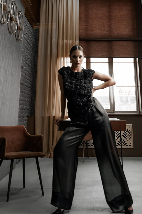 Брюки из нарядной полупрозрачной ткани «органза», прямые, широкие. Средняя посадка, пояс притачной, застежка спереди на молнию и декоративную пуговицу. Брюки с глубокими складками по переду. Брюки на подкладке в виде шорт.