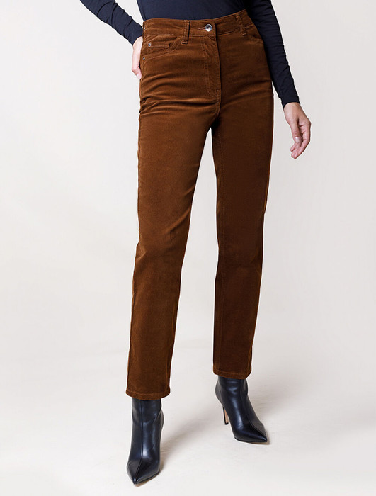 Брюки выполнены из мягкого хлопкового микро-вельвета с добавлением эластана. Изделие комфортно садится по фигуре и не сковывает движения. Модель с пятью карманами, как у джинсов-скинни дополнена высококачественной фурнитурой с фирменным логотипом бренда. Хорошо комбинируется с вязаным трикотажем, блузками и денимом. Как альтернатива брюкам, в нестрогий офисный дресс-код.