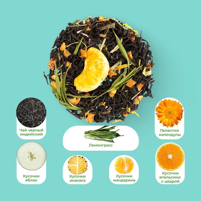 ананас кусочки, апельсин кусочки с цедрой, календула лепестки, лемонграсс, мандарин кусочки, чай черный, яблоко кусочки