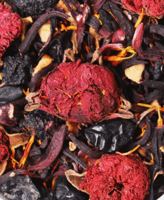 Купаж на основе каркаде , с добавлением сушеного барбариса, вишни, кусочков сушеного яблока, лепестков сафлора. Содержит пищевые ароматические масла.