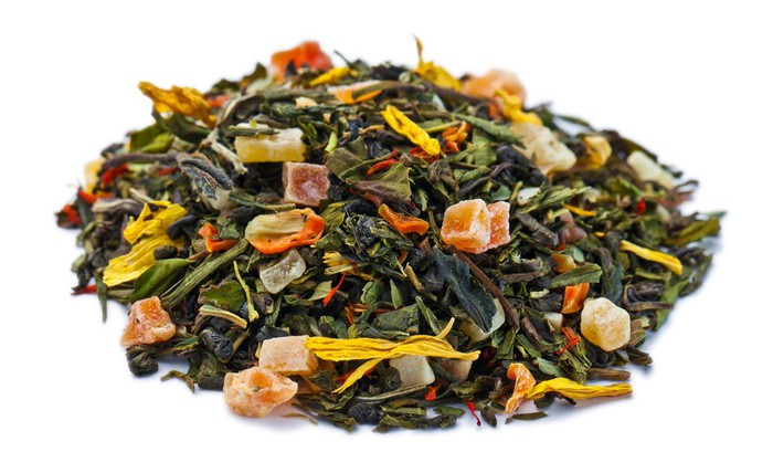 Краткое описание: Купаж зелёного и белого чая с кубиками папайи и ананаса, хлопьями моркови, листьями клубники, лепестками подсолнечника и сафлора, и нежным фруктовым ароматом.