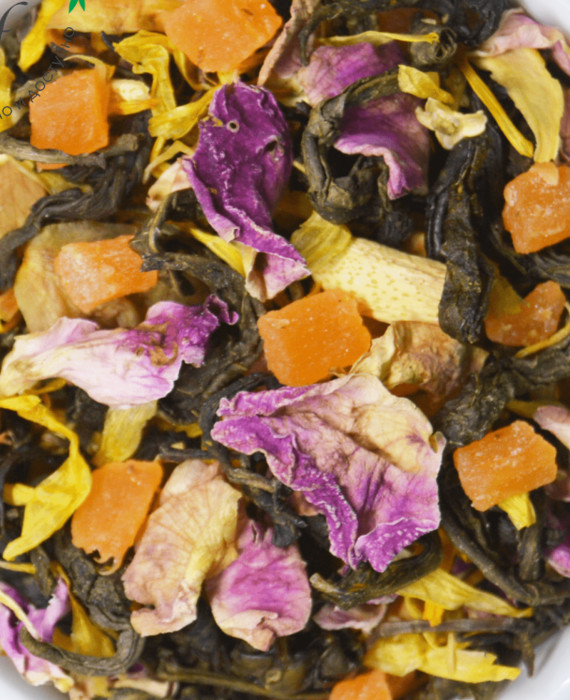 Купаж на основе классического зеленого чая Ганпаудер слабой скрутки с добавлением цукатов цветков апельсинового дерева, лепестков сафлора и розы. Содержит пищевые ароматические масла.