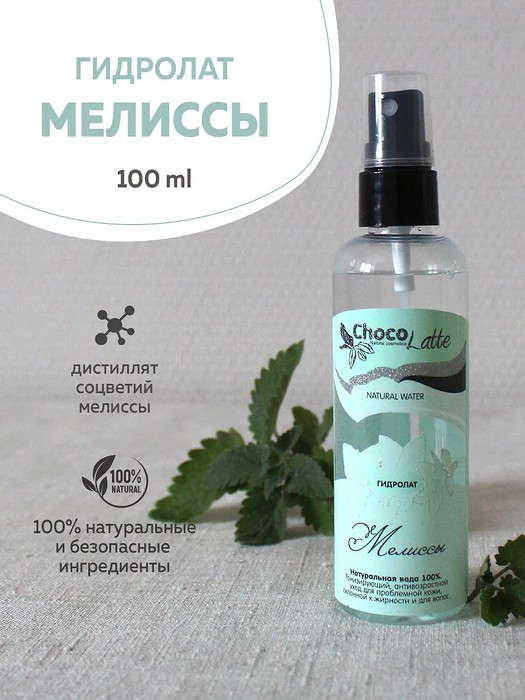 Вода получаемая в процессе водно паровой дистилляции соцветий мелиссы. Не содержит искусственных добавок, красителей и консервантов.