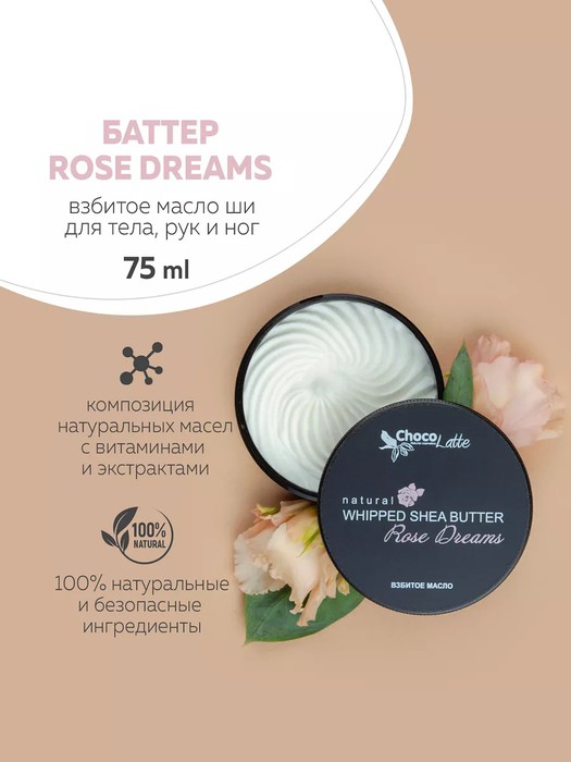 Натуральный баттер ROSE DREAMS питает, увлажняет и смягчает кожу. Устраняет сухость и шелушение, способствует заживлению микроповреждений. Повышает тургор и эластичность кожи.