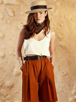 Джемпер свободного кроя из фактурного трикотажного полотна джерси. Спущенная линия плеча, короткий рукав, по низу рукава вышивка. V-образная горловина с широкой обтачкой, внизу изделия нашивка дерево. По спинке средний шов.