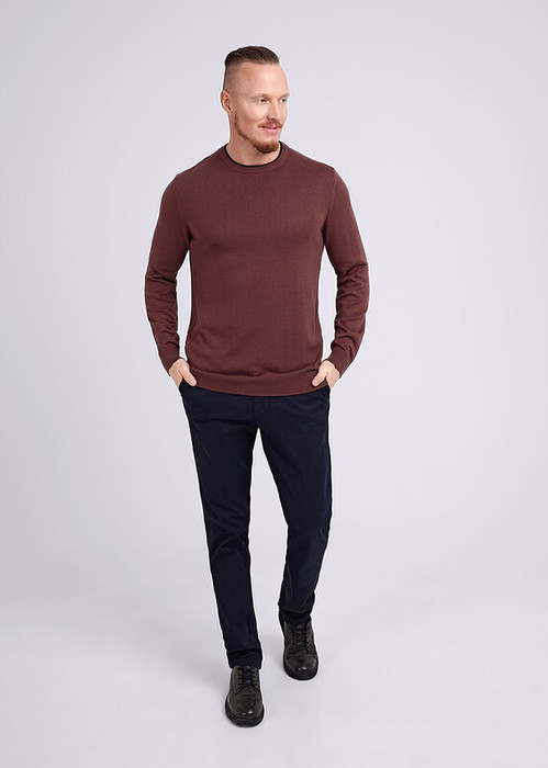 Классический вязаный джемпер с круглой горловиной. Изделие изготовлено из смесовой пряжи с содержанием хлопка. Данный джемпер удачно впишется в повседневный гардероб современного мужчины, привнося тепло, комфорт и элегантность одновременно.