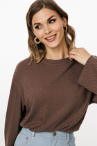 Вязаный джемпер умеренного объема из акриловой пряжи с добавлением хлопка, переплетение полуфанг. Округлая горловина с бейкой. Длинный рукав со спущенной линией плеча. По низу изделия и рукава манжет. Спереди нашивка металл.