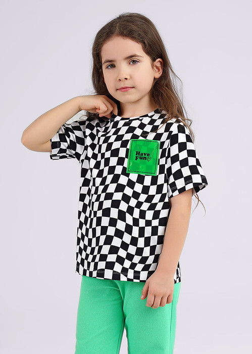Футболка с трендовым принтом ""шахматка"" идеально подходит для летнего сезона! Выполнена из эластичного хлопка. Спереди модель дополнена нашивкой. Подберите к футболке юбку или джинсы, сандали или кеды — стильный аутфит готов!