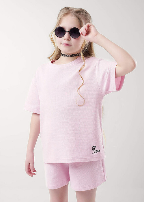 футболка среднего обьема из трикотажного ""вафельного"" полотна. Горловина оформлена эластичной обтачкой из основы. Спереди вышивка в летней тематике.