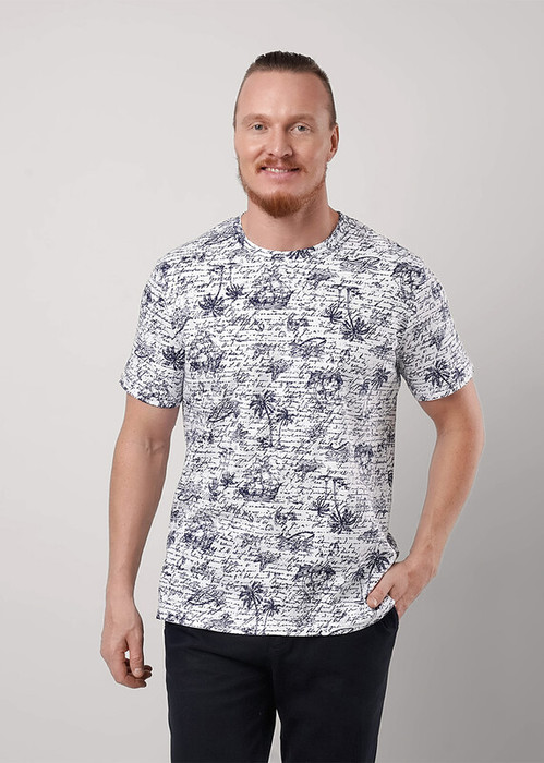 Мужская футболка из дышащего полотна ""Пике"" с большим содержанием хлопка. С круглой горловиной и коротким рукавом. Модель дополняет дизайнерский принт и имиджевая фурнитура. Отличный вариант для повседневного образа с джинсами.