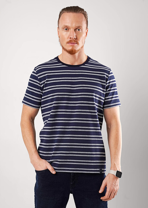 Футболка из фактурного полотна ""пике"". Интересное звучание модели придаёт дизайнерская набивка в полоску. Такая модель разнообразит любой образ и прекрасно подойдёт к брюкам или джинсам. Изделие дополнено имиджевой вышивкой.