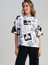 Джемпер оверсайз из хлопкового трикотажного полотна. Короткий спущенный рукав. Круглый вырез горловины обработан рибаной. По переду принт вспенкой.