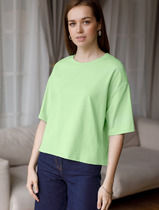 Укороченная футболка с втачным рукавом из кулирной глади. Модель универсального базового цвета с буквенным принтом.