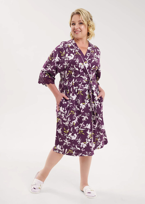 Халат для дома на запах свободного прямого кроя из хлопкового трикотажного полотна с добавлением модала. По борту обтачка с кантом. Карманы в боковых швах. По талии пояс со шлевками и внутренними завязками. Спущенный рукав длиной 3/4, по низу кружево.