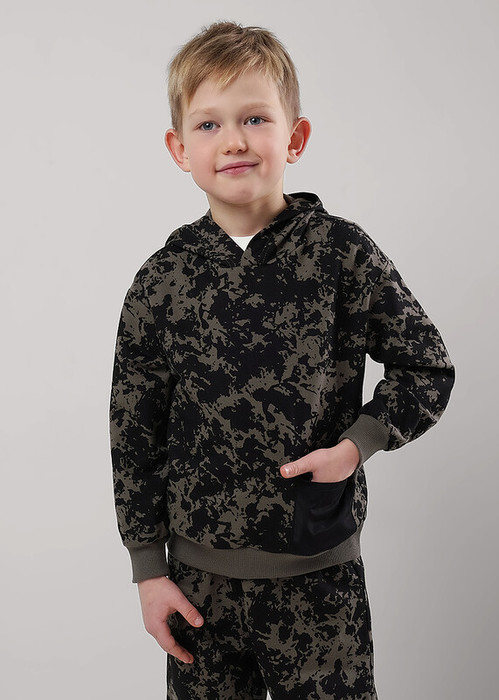 Набивная худи из хлопкового футера для активной жизни ребёнка. Комфортная посадка, манжеты и пояс из кашкорсе. Стильный элемент - накладной карман из плащёвки. Сочетай с любимыми джоггерами и будь в тренде.