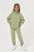 Комплект из футера - идеальная база для активного отдыха! Худи среднего объёма, низ рукава на резинке. Спереди минималистичный принт. Широкие брюки среднего объёма, эластичныйс пояс на резинке.