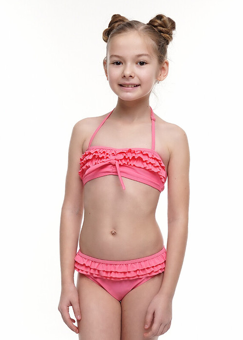 Купальник бикини яркого цвета с озорными оборками впереди .Верхняя часть -бандо со сборкой по центру и завязкой бантом .бретель с регулировкой. Сзади удобная застежка. Впереди подклад. удобные бикини с подкладом на ластовице