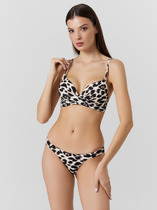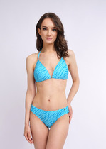 Раздельный, женский купальник в монохромную набивку. Лиф выполнен в виде треугольной, формованной чашки, с завязками на шее и спине. Плавки бикини комфортной посадки. Завершают дизайн металлические нашивки на лифе и плавках.