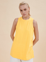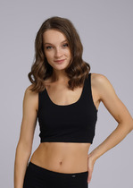 Майка из хлопкового трикотажного полотна рибана. Умеренный объем. Широкая бретель, округлая горловина. По горловине и пройме окантовка.